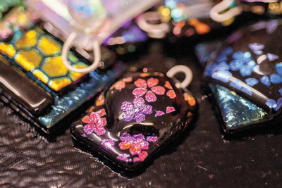 Beholders of her glass-fused jewelry always take a second look. Unique pieces of varying sizes, shapes and colors, some wrapped in wire or accented with beads, become an usual gift or favorite accessory. Yet for Cynthia, each small piece of jewelry means much more — a representation of what artists call a five- minute sketch.